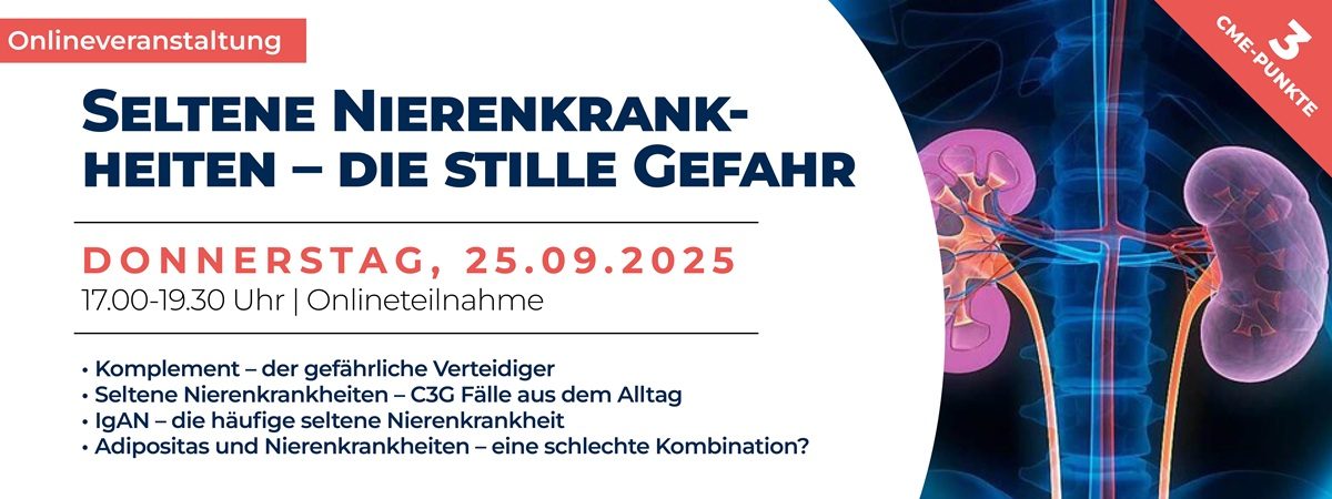 Die virtuelle Fortbildungsveranstaltung „Seltene Nierenkrankheiten – die stille Gefahr: Diagnostik, Therapie und interdisziplinäre Perspektiven“ am 25. September 2025 bietet eine einzigartige Gelegenheit, kompaktes, praxisnahes und wissenschaftlich fundiertes Wissen zu einem hochspezialisierten Thema zu erhalten. Unter der wissenschaftlichen Leitung von Prof. Dr. Adrian Schreiber von der Charité – Universitätsmedizin Berlin werden in einem kompakten zweieinhalbstündigen Programm die neuesten Erkenntnisse, innovativen Therapieoptionen und klinischen Erfahrungen rund um Seltene Nierenkrankheiten vorgestellt. Diese Erkrankungen sind oft schwer zu diagnostizieren, verlaufen lange unbemerkt und führen ohne rechtzeitige Behandlung zu schweren gesundheitlichen Folgen. Ziel der Veranstaltung ist es, das Bewusstsein für diese stillen, aber folgenreichen Krankheitsbilder zu schärfen und Ärztinnen und Ärzten konkrete Handlungsempfehlungen an die Hand zu geben.